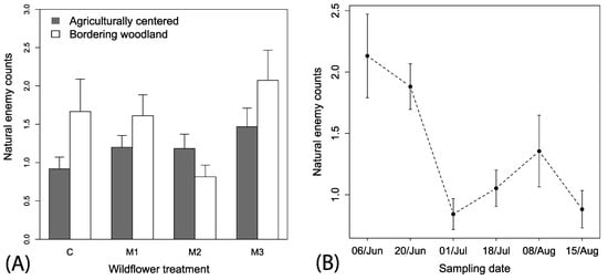 Predator counts were not spatially autocorrelated with site locations (Mantel’s test, r2 = 0.38, p = 0.314). A total of 619 natural enemies (Araneae, hymenopteran parasitoids, Coccinellidae, Geocoridae, and Nabidae) were observed in wildflower plots. Natural enemy counts were variable, but the best fitting model suggests populations were changing over time and there were interactive effects of local context and wildflower mix (i.e., ΔAIC > 3 for other models; Figure 4A,B). There was an overall tendency for natural enemies to be observed more frequently in plots with wooded borders (F1, 446 = 3.17, p < 0.076, Figure 4A) and an interaction between local context and wildflower mix included in the model was the best fitting, but not statistically significant (F3, 446 = 1.65, p = 0.177), which indicates a tendency for higher numbers of natural enemies in wooded bordered plots in M1, and M3, but lower than expected in M2 (Figure 4A). There was a strong significant seasonal time effect of decreasing and fluctuating numbers of natural enemies (F1, 446 = 20.44, p < 0.001, coefficient estimate = −0.06 (0.01), t-value = 4.52; Figure 4B).