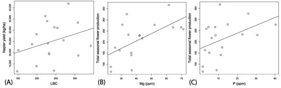 Correlation between estimated Napier yields from field buffer plots and LBC (A). Correlations between soil nutrients and total seasonal production of wildflowers pooled for the entire plot in relation to Mg (B), and P (C).