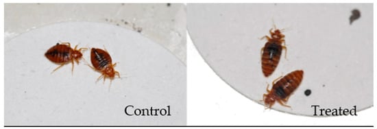 Intoxicated bed bugs became inactive and paralyzed at first, and subsequently died in relaxed positions (Figure 1). Their abdomen showed separation of clear liquid and black matter after death, possibly due to coagulation of indigestible blood in the gut.