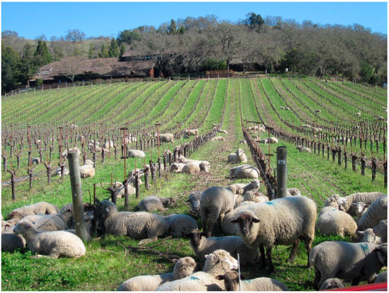 Some vineyards bring in herds of sheep in the spring to graze down overwintering cover crops (Figure 2) [86]. As the sheep consume the cover crop, they deposit manure, which improves soil fertility. While sheep are not primarily used as a pest management strategy, they may inadvertently consume pests residing on the cover crop, such as leafhoppers, mites or thrips, although this has never been evaluated.