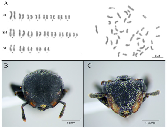 Conventional staining of the complete chromosome set of Cephalotes pusillus. Karyotype and metaphase of female workers of C. pussilus 2n = 44 sorted according to centromeric index (A). Automontage front-view pictures of C. pussilus soldier (B) and worker (C).