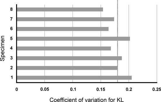 Coefficient of variation (CV) of karyotype length. CVs for karyotype length of the specimens of Cephalotes pusillus measured. The dash line represents the mean CV.