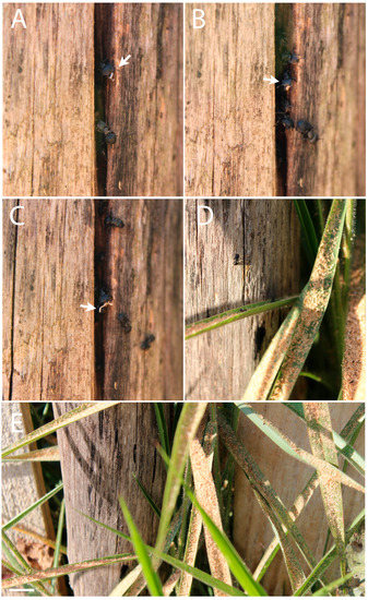 Cephalotes pusillus digging behavior records. (A–C) Workers unloading the small fragments of wood or sawdust; (D,E) accumulation of sawdust thrown away by the workers above the vegetation under nest.