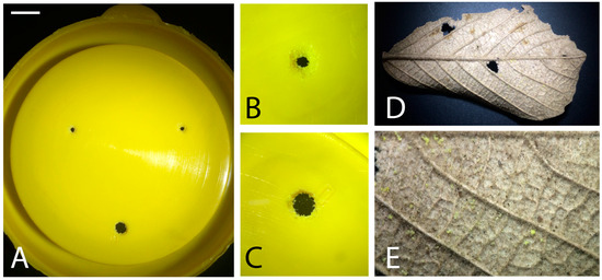 Laboratory observations of Cephalotes pusillus digging behavior. The figure shows holes and plastic fragments from lids of rearing systems. (A–C) The workers were able to make the small holes bigger to escape. (D,E) Plastic yellow fragments on leaf.
