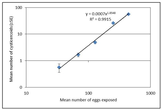 Mean number of cysticercoids (±SE) after exposure with five different concentrations of eggs based on dissection of 45 Tenebrio molitor per dose (three repetitions each with 15 beetles). The relationship between egg dose and establishment of cysticercoids was best explained by a power function: (Number of established cysticercoids = 0.0007 × egg dose 1.8548, R2 = 0.9915). Presented values in the figure are on logarithmic scale.