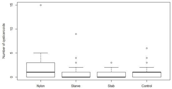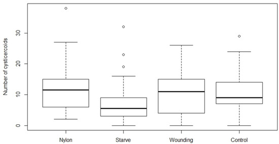 Number of cysticercoids developed after exposing Hymenolepis diminuta eggs (79 ± 6 SD) with different treatment strategies on Tenebrio molitor host. The average number of T. molitor hosts used for counting cysticercoid was 27, 43, 25 and 30 for nylon, starvation, wounding, and control group, respectively. The nylon group refers to the insertion of a 2 mm nylon filament into the body cavity. Starvation refers to deprivation of food for 10 days, while the wounding group served to test the effect of the injury on the abdomen without the insertion of the nylon filament. The control group received ad libitum food and did not receive any treatment.