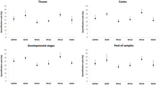 In Camponotus floridanus, the homologues RPL32, RPL18, EF1a (elongation factor 1-alpha) and GAPDH were evaluated. For the RPL32 gene, higher expression stability was observed in the analyses with pupa [42], in agreement with the evaluation performed on development stages in our study, in which the RPL32 gene appears ranked in second place (Table 5). Using BestKeeper, this same study showed low Cq variations in expression levels in different tissues and in development stages for all tested reference genes, indicating that all are suitable to be used as reference genes, even though they have not been validated. These results diverge from our data obtained by RefFinder, which shows high specificity for a particular experimental situation and how much careful analysis of candidate reference genes is required for each particular case.