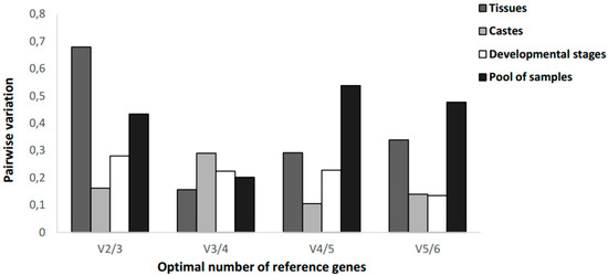 Finally, for gene expression analysis at the development stages (larva, pupa and forager), the pairwise variation values for V5/6 were the lowest (0.134), indicating that the combination among five most stable reference genes would be sufficient for the gene expression normalization.