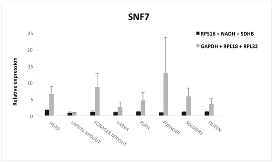 Differential gene expression of SNF-7 using the selected reference gene. Relative gene expression quantification was performed using two different normalization strategies: the combination of the three top ranked genes and combination three most unstable genes. The columns represent the gene expression in different samples (head, larval midgut, forager midgut, larva, pupa, forager, soldiers and queen) of Atta sexdens. Error bars indicate standard deviation (SD).