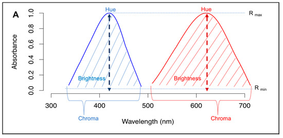 Properties of light. (A) Graphic illustration of two different spectra with respective color metrics. The blue spectrum has a peak wavelength of 420 nm whereas the red spectrum has a peak wavelength of 620 nm. Thus, the hue of the blue spectrum is 420 nm and the hue of the red spectrum is 620 nm. The blue spectrum spans a shorter range of the spectrum and thus is more chromatic than the broader red spectrum. The shading under each spectrum represents overall brightness and as the red spectrum is larger than the blue spectrum, it has a greater brightness. For a more in-depth description of color parameters and formulae, see [21]. (B) A graphic representation of polarized light. A light source produces unpolarized light, in which the e-vectors of light are oriented randomly, then as the light travels through the filter, only light in one orientation is transmitted resulting in polarized light. Figure 1B was adopted from physics.stackexchange.com ©.