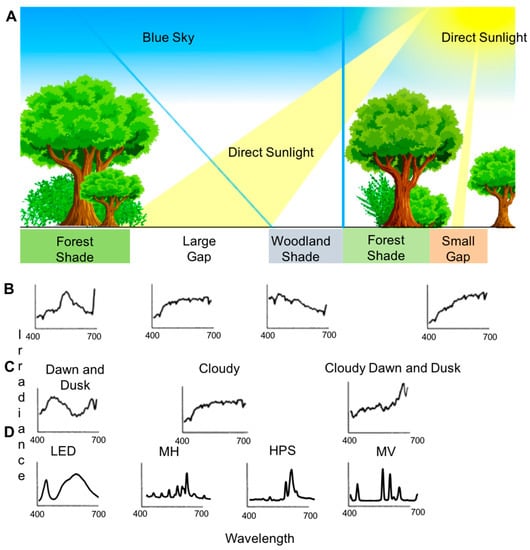 Natural light conditions are dependent upon time, space, and environmental factors [5,18]. Light conditions change throughout the day, night and year. Lighting is also dependent upon the landscape (e.g., forest vs. savannah), weather, lunar cycle and celestial bodies. Furthermore, lighting is complicated by its own physical properties which include wavelength, frequency, polarization, hue, chroma, and intensity [19]. It is vital that lighting is studied with all of these parameters in mind as biological functions have evolved under specific lighting conditions that depend upon time, space, weather, and the spectral properties of light.