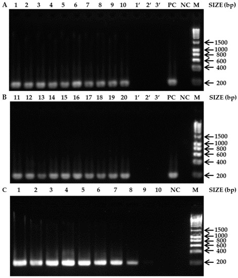 Agarose gels of PCR products. (A) A. tumida specimens from its native range and other Aethina spp: 1. A. tumida (Benin); 2. A. tumida (Togo); 3. A. tumida (Nigeria); 4. A. tumida (Central African Republic); 5. A. tumida (Burkina Faso); 6. A. tumida (Democratic Republic of Congo); 7. A. tumida (South Africa); 8. A. tumida (Ethiopia); 9. A. tumida (Tanzania); 10. A. tumida (Madagascar); (B) A. tumida specimens from its introduced ranges and other Aethina spp.: 11–12. A. tumida (US); 13. A. tumida (Brazil); 14. A. tumida (Costa-Rica); 15–16. A. tumida (Australia); 17. A. tumida (Portugal); 18. A. tumida (Italy); 19. A. tumida (Jamaica); 20. A. tumida (South Korea); 1’. A. inconspicua (South Korea); 2’. A. flavicollis (South Korea); 3’. A. concolor (Australia); (C) Gel of PCR validating the sensitivity test for the primer pair AT430F and AT622R. The concentration of template DNA from lane 1 to lane 10 was 100, 50, 25, 10, 5, 1, 0.5, 0.1, 0.01, 0.001 ng/µL respectively. PC = Positive control; NC = Negative control; M = Molecular marker (HyperLadder™ 1 kb).
