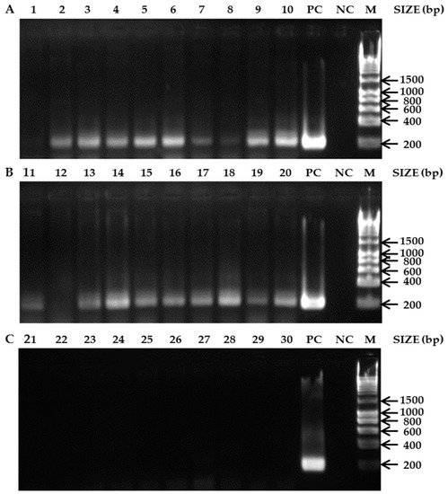 Agarose gels of PCR products. (A) Non-infested A. mellifera colonies from Nigeria based on visual screening; (B) SHB-infested A. mellifera colonies from Nigeria based on visual screening. (C) SHB-free A. mellifera colonies from Switzerland. 1. A. mellifera colonies (Ile-Ife); 2. A. mellifera colonies (Otan-Ile); 3. A. mellifera colonies (Lampese); 4. A. mellifera colonies (Logbara); 5. A. mellifera colonies (Tilden fulani); 6. A. mellifera colonies (Gubi); 7. A. mellifera colonies (Sarkin Pawa); 8. A. mellifera colonies (Kaltungo); 9. A. mellifera colonies (Kumo); 10. A. mellifera colonies (Rano); 11. A. mellifera colonies (Idi-Isin); 12. A. mellifera colonies (Ibule-Soro); 13. A. mellifera colonies (Ibule-Soro); 14. A. mellifera colonies (Ota); 15. A. mellifera colonies (Ota); 16. A. mellifera colonies (Logbara); 17. A. mellifera colonies (Logbara); 18. A. mellifera colonies (Itagbere); 19. A. mellifera colonies (Gubi); 20. A. mellifera colonies (Bebeji); 21. A. mellifera colonies (Aare 1); 22. A. mellifera colonies (Aare 2); 23. A. mellifera colonies (Aare 3); 24. A. mellifera colonies (Aare 4); 25. A. mellifera colonies (Liebefeld 1); 26. A. mellifera colonies (Liebefeld 2); 27. A. mellifera colonies (Liebefeld 3); 28. A. mellifera colonies (Liebefeld 4); 29. A. mellifera colonies (Liebefeld 5); 30. A. mellifera colonies (Liebefeld 6); PC = Positive control; NC = Negative control; M = Molecular marker (HyperLadder™ (Bioline Reagents Limited, London, UK) 1 kb).