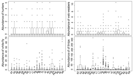 Abundance of hunter spiders, web-weaver spiders and the pests Bemisia tabaci and Frankliniella occidentalis in the different plant species using the plant codes from Table 1.