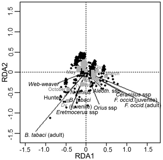 Month of sampling was such a highly significant variable in arthropod populations. Temperatures from late summer create the ideal conditions for whitefly to thrive in native vegetation outdoors. On the other hand, western flower thrips populations build up on native plants throughout the colder season, from December to May. The increase in spider populations was tied to the weather conditions from late-spring and summer, especially for hunter spiders, that remained abundant during summer (data not shown). In addition, it is important to note that hunters and web-weavers are more abundant in certain plant species. This information is crucial in ecological terms because it could provide clues as to where and when spiders are likely to be prevalent, indicating co-occurrence between spiders and horticultural pests and thereby show the likelihood of biocontrol. For instance, spiders were mainly found on the small Mediterranean shrub Crithmum maritimum. However, this plant, like other native shrubs such as E. fragilis or L. intricatum, supports very low levels of the two pests, B. tabaci and F. occidentalis (Figure 1), suggesting that spatial co-occurrence between pests and spiders might not occur in certain plant species. Nevertheless, some plants such as G. umbellata, R. officinalis, D. viscosa, T. vulgaris and A. cytisoides were selected by spiders and also supported levels of pests, suggesting that there is spatial co-occurrence between NEs and pests and therefore the probability of biocontrol. In fact, the GAM showed the significant effect of whiteflies on spider’s abundance (hunter and web-weavers) and the effect of F. occidentalis on hunter’s abundance. Some Thomisidae species have been reported to be potential predators of F. occidentalis in vegetable crops [37]. However, RDA showed no correlation between F. occidentalis and spiders, suggesting that spiders avoid preying on F. occidentalis. Indeed, thrips are rarely found to be part of spider food webs [34,35]. Therefore, the result that the GAM showed that F. occidentalis has a significant effect on hunters is in contrast to the RDA analysis. Adjusted R^2 was 15.6%. Therefore, a few other variables not captured by the model could be expected to be predictors of pest populations outdoors. Such factors could be different farming practices and pests’ abundance into greenhouses. The lack of correlation between F. occidentalis and spiders could therefore be partly explained by the different seasonal distribution patterns of spiders in native plants as compared to those of F. occidentalis, which is especially abundant outdoors during the colder months, especially in March. In fact, RDA showed that the abundance levels of F. occidentalis and its NEs were high in March, while spiders were more abundant during the warmer season. Therefore, it is possible that spiders and thrips co-occur for biocontrol only in a short period of time. Regarding the whitefly, hunters exhibit a strong positive relationship with adult and nymphal-stage B. tabaci, which points to the sessile juveniles of the pest as a suitable part of the spiders’ diet. The intermediate relationship reported between web-weavers and the two stages of whitefly could be explained by the prey suitability of B. tabaci for this spider guild, suggesting that web-weavers might prefer to feed on adult-stage rather than nymphal stage of the pest. Most web-weavers largely depend on relatively few prey groups available in large numbers in a particular environment, whereas hunters feed on both moving and sessile prey as a result of their mobile foraging strategy [34]. Regarding the NEs, the positive relationship between spiders (hunters and web-weavers) and whitefly NEs may also indicate consumption of the predatory bug N. tenuis or the parasitized nymphal-stage by spiders and thus unidirectional intraguild predation (spiders on whitefly NEs). For instance, web-weavers are known to mainly capture minute soft-bodied insects, with Heteroptera appearing to be a more suitable source of food for hunters [34]. Similarly, it has been found that generalist predators, such as carabid and staphylinid beetles, as well as linyphiid spiders, may disrupt parasitoid aphid control through direct and coincidental intraguild predation [47]. Nevertheless, the interaction between spiders and whitefly NEs supports the hypothesis of positive NE–whitefly interactions rather than intraguild predation between spiders and whitefly NEs. In fact, RDA showed that pest availability is a strong predictor of the abundance of NEs in native plants.