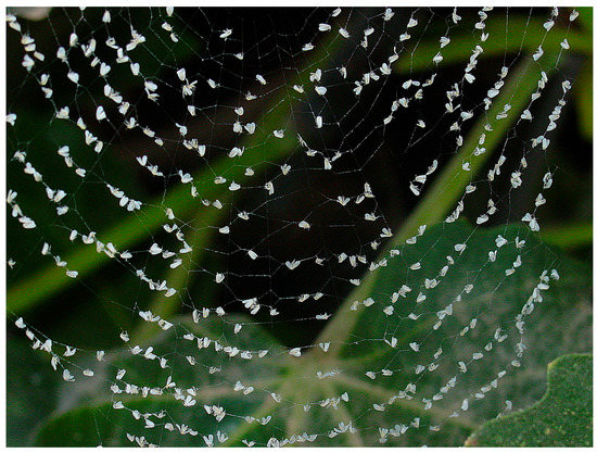 Example of B. tabaci adults trapped in webs built by web-weavers from crops surrounding greenhouses in the study area (Almeria, SE Spain). Photo: Jan van der Blom.
