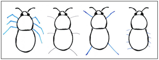 Selected examples of the legs drawn on the bumblebee body by students. The illustration on the far left shows an example that was rated as correct. The second illustration from the left shows the most common task solution of students. The two illustrations on the right represent alternative common sketches of bumblebee legs.