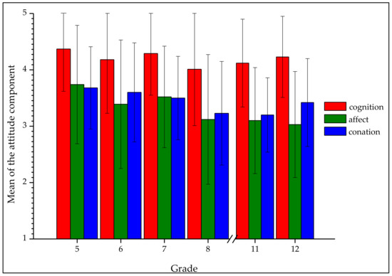 Large standard deviations within the attitude of one grade level probably partly result from the construct of the attitude itself (Table 5 and Figure 3). The attitude is an individual characteristic that does not have to be the same within an age group; nevertheless, the mean and the standard deviation are instructive in comparisons between grade levels.