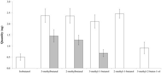 Ten volatile molecules were collected and identified from the honeydew of aCO2 aphids (Table 1). Acetaldehyde, 2-thiapropane, ethanol, and 2-propanone were detected in all replicates, but not quantified (the first two were under the limit of quantification, the last two co-eluted with the solvent in the quantification purpose). The quantities of other detected molecules were estimated by using different linear correlations obtained with the calibration curves (Supplementary Table S1 and Figure S1). Curves were developed by using the areas of each compoundi (xi) and the quantity of compoundi injected (yi). Acetaldehyde was not detected from eCO2 aphids. Six compounds where quantified from aCO2 aphids (Figure 1); namely, isobutanol, 3-methylbutanal, 2-methylbutanal, 3-methyl-1-butanol, 2-methyl-1-butanol, and 3-methyl-2-buten-1-ol. Isobutanol, 2-methyl-1-butanol, and 3-methyl-2-buten-1-ol were not observed in eCO2 aphids. More 3-methyl-1-butanol was found in aCO2 aphids (Tukey’s HSD: p = 0.009).