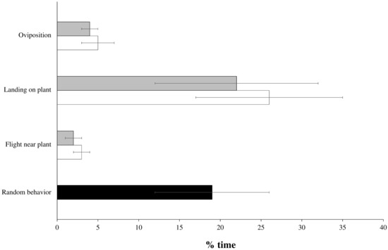 Because the results of the previous experiment obtained different semiochemistry in the honeydew of aphids reared under aCO2 and eCO2 concentrations, we tested the hypothesis of a cascade effect on the searching and oviposition behaviors of an aphid predator. Young plants (i.e., phenological stage 10 on the BBCH scale) grown either under aCO2 or eCO2 conditions were isolated in plastic containers (50 cm3) filled with perlite:vermiculite substrate and 30 mL of water. The plants were covered with 35 µL fresh honeydew that had been collected from the corresponding CO2 treatment (see Section 2.2). This amount was previously shown to induce oviposition in hoverflies [16,17]. According to our quantification assays, this volume represents a quantity of honeydew excreted by 50 adult aphids over 24 h. After honeydew deposition, plants were left over for 30 min to let the honeydew dry. The behavioral experiment started with the introduction of a single mated and gravid hoverfly female in a flight cage (25 × 25 × 65 cm; Bugdorm, Megaview Science, Taiwan) in the presence of two plants, one from each CO2 condition. One hour after the beginning of the experiment, behavioral observations were made using the software The Observer XT (Noldus Technology©, Wageningen, The Netherlands) for 30 min. During observations, the duration of the following behaviors were recorded: (i) random flight and landing on the cage; (ii) stationary-oriented flight near a plant; (iii) walking on a plant; and (iv) oviposition (the hoverfly extended its abdomen and touched the plant stem or leaf with its ovipositor). Here again, the experimenter was considered naïve, with no knowledge of the CO2 condition that the plant and honeydew were obtained from. The number of eggs laid on each plant was counted for four hours after introducing the female. The experiments were conducted under laboratory conditions (T: 21 ± 1 °C; RH: 60 ± 10%; [CO2]: 450 ± 50 ppm). Hoverfly females were 17 to 24 days old and had not previously been exposed to aphid products. The behavior of 20 females was recorded.