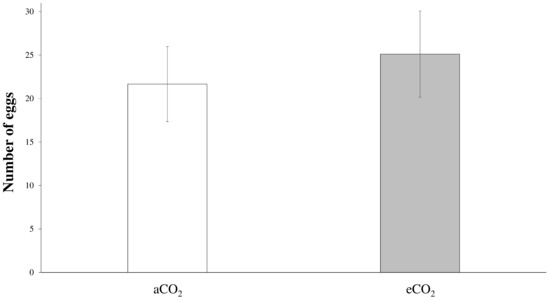 Mean (±SE) number of eggs laid by the hoverfly females on plants smeared with crude honeydew from aCO2 (white bars) and eCO2 (grey bars) conditions.