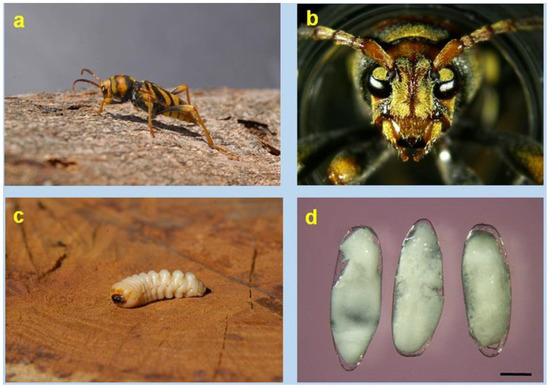 X. chinensis body is quite large (15–25 mm in length, N = 25), the antennae are short and widely separated, characteristic bands adorn the elytra and the pronotum (Figure 1a,b). A complete set of physical characteristics for diagnostic purposes of the adult was provided by Cherepanov [6], including a B/W drawing of the beetle in dorsal view. Han and Lyu [20] also provide a description of the adult along with colour pictures showing it in dorsal and lateral views. Specific descriptions for the larvae, pupae and eggs seem to be lacking. The larvae look typically longhorn, i.e., they have a conical-shaped trunk with very well marked pseudopoda and a whitish colour (Figure 1c). The eggs are white, elongated, rounded at poles, narrowing towards the caudal end, with an average length of 2 mm, and width 0.7 mm. The oocyte is protected by a transparent flexible chorion with no apparent ornamentation when seen under a binocular stereomicroscope (Figure 1d).