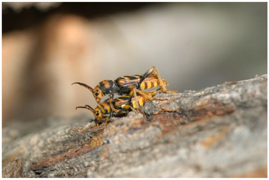 - Iwabuchi, K. Mating behavior of Xylotrechus pyrrhoderus Bates (Coleoptera: Cerambycidae): 1. Behavioral sequences and existence of the male sex pheromone. Appl. Entomol. Zool. 1982, 17, 494–500. [Google Scholar] [CrossRef]