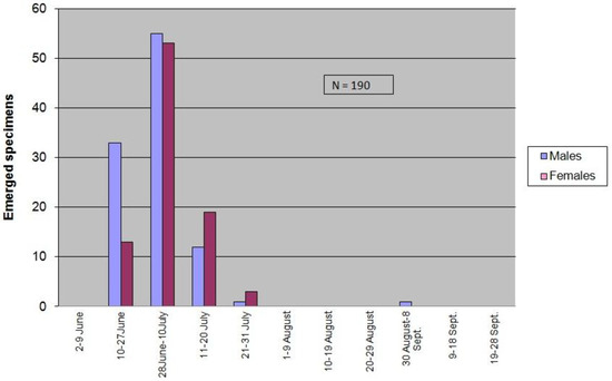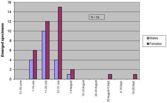 In the summer of 2016, only 56 adults (33.93% males; 66.07% females; male/female ratio: 0.51) emerged from mulberry bolts collected in October 2015 (see above). Emergences started 1 July and ended 3 August (91.07% in July; 5.36% in August). There was no clear protandry or protogyny. Exceptionally, two females emerged extemporaneously on 5 and 24 September (3.57%) (Figure 3).