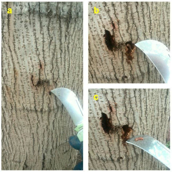 Based on our observations with live mulberry trees in parks and gardens, X. chinensis larvae feed hidden underneath the periderm (formed by cork and cork cambium) of mulberry trees, either along trunks (Figure 5a,b) or at the base of main tree branches, where they join the trunk (Figure 5c). Mature or old trees are preferred; attacks on young trees are rare, most likely because their narrower trunk diameter provides less food and shelter to the larvae. The latter feed only on the phloem and vascular cambium, tunneling upwards or downwards, and so making longitudinal cavities that reach 15–25 cm in grown larvae.