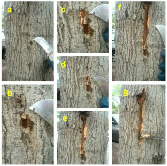 Aruga [28] had already mentioned that the larvae of X. chinensis feed mainly on ‘cambium’; we interpret this author’s ‘cambium’ as equal to phloem plus vascular cambium as mentioned above. In mulberry trees, especially in those belonging to the fruitless variety, the periderm is quite thin and dries out when the underlying phloem is consumed, so small cracks or slits, but not proper holes made by the larvae, appear on its surface which are used for aeration and some removal of frass. Most frass though stays within the cavities. These tiny periderm openings, not being holes, are not very obvious while the larva feeds and hides underneath, making larval detection difficult (Figure 6 and Figure 7). Interestingly, mulberry phloem contains a white latex (see Figure 8a) which is usually exuded after tissue injury and serves mainly as defense against herbivorous insects; this latex does not appear to prevent X. chinensis larvae from eating the phloem.