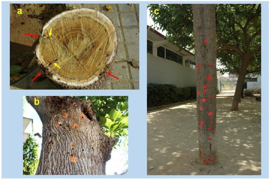 (a) X. chinensis phloem and xylem larval cavities. Note white latex exuding in mulberry phloem after cutting the trunk, excepting the sections consumed and damaged by the beetle’s larvae (red arrows). Xylem tunnels (yellow arrows) are excavated generally at right angles with the phloem cavities; the larvae will pupate in them. (b,c) Adult emergence holes in heavily infested mulberry trees. ((a,c): photos V. Sarto i Monteys; (b): photo G. Torras).