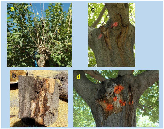 Damage to mulberries is mostly produced as a result of the progressive disappearance of the phloem and vascular cambium due to larval feeding (Figure 8a, red arrows). The room originally taken up by these living tissues is replaced by a cavity along which the larva moves up and down and packs larval frass. Therefore, in damaged parts, the two-way flow of water and food (phloem sap) stops. When this happens at the base of big branches, shoots start to wilt and leaves are lost (Figure 9a). In severe infestations, when several cavities meet, the periderm covering them easily breaks off showing the woody xylem underneath (Figure 9b,c); without cover, the xylem sapwood begins to dry and crack externally, this being especially obvious at the base of big branches (Figure 9d). Cracks in damaged bark and emergence holes that reach deep into the xylem may also facilitate infections by bacteria and fungi, as well as infestations by other insects. Eventually this causes the death of the tree.