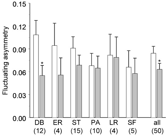 Fluctuating asymmetry of experimental (grey) and control shoots (white) of Betula pubescens in 2009, the year after the experimental shoots were damaged by the following insect herbivores: DB—Deporaus betulae, ER—Eriocrania semipurpurella and E. sangii, ST—Stigmella spp., PA—Parornix spp., LR—leafrolling larvae, SF—mining sawflies, all—all groups pooled. Values are estimated marginal means; bars indicate standard errors; sample sizes (numbers of shoot pairs) are shown in parentheses. An asterisk indicates significant (p < 0.05) difference between experimental and control shoots (individual herbivores: t-test; all herbivores combined: Wilcoxon signed-rank test).
