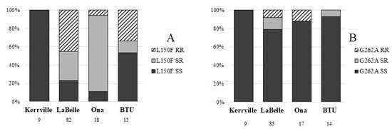 Percentage of horn fly resistant genotypes determined through a multiplex PCR. (A) illustrates genotyping for L150F, while (B) shows genotyping for G262A mutations. Laboratory strain = Kerrville (susceptible); field strains = LaBelle, Ona and BTU. RR = homozygous resistant, SR = heterozygotes, SS = homozygous susceptible. Number below fly strain name is the number of flies genotyped.
