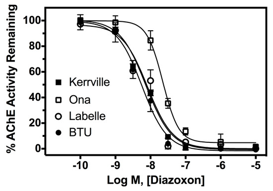 In vitro potency assays were used to determine the affinity of diazinon to wildtype and field collected horn fly AchE (Figure 2). The IC50 value of diazoxon for the Kerrville (susceptible) population was found to be 8.2 nM (95% CI: 6–10 nM; Hillslope: −1.0; r2: 0.99). The IC50 values of diazoxon for the Labelle and BTU populations were found to be not statistically significant when compared to Kerrville with IC50 values of 9.2 nM (95% CI: 5–15 nM; Hillslope: −1.1; r2: 0.99) and 6.1 nM (95% CI: 5–7 nM; Hillslope: −1.1; r2: 0.99), respectively. However, the Ona population was found to be significantly less sensitive (p < 0.01) to diazoxon inhibition when compared to Kerrville, Labelle, and BTU populations, having an IC50 value of 20.5 nM (95% CI: 18–23 nM; Hillslope: –2.2; r2: 0.99).