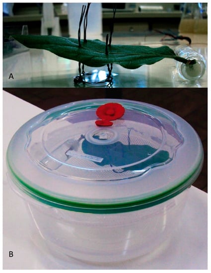 To determine the optimal microclimatic temperature and RH for N. floridana primary conidia and capilliconidia production in a mimicked leaf-boundary layer situation, a detached Jack bean leaf assay was conducted inside a plastic chamber (22.9 × 21.3 × 12 cm—Sanremo®, Flower line). The chambers contained 350 mL of a sulfuric acid solution at appropriate concentrations to obtain the targeted RHs as described by Solomon [31] and were placed in climatic chambers to obtain the desired temperatures (Figure 1). Five RH levels (80, 85, 90, 95 and 100%) in combination with four temperature levels (13, 17, 21 and 25 °C) were tested. Temperature levels were chosen based on the average yearly temperatures observed between 18:00 and 06:00 in Piracicaba, São Paulo, Brazil (http://www.ler.esalq.usp.br/posto.html). A digital thermal hygrometer (Instrutherm—HT-500) was used inside the plastic chamber to confirm RH and temperature were accurate. Each experimental unit consisted of a Jack bean leaf with its petiole inserted into a 15 mL glass tube filled with distilled water and sealed with paraffin, to prevent the petiole from moving and evaporation of the water (Figure 1). Two N. floridana killed and mummified T. urticae females were placed on the abaxial side of each leaf. A photo-etched cover slip (18 × 18 mm) with alphanumeric coded squares (Electron Microscopy Sciences, Hatfield, PA, USA) was placed 1 cm below the leaf and cadavers in order to collect conidia. The experimental unit was kept in darkness inside the chamber for 12 h. Numbers of primary conidia and capilliconidia were counted on each photo-etched coverslip surface using a phase contrast microscope (×400). Primary conidia that were in the process of forming or had already formed a capillary tube were defined as capilliconidia, all others were considered primary conidia. Five replicates of each RH × temperature combination were performed yielding a total of 10 mummies per treatment and 160 mummies for the entire experiment.