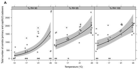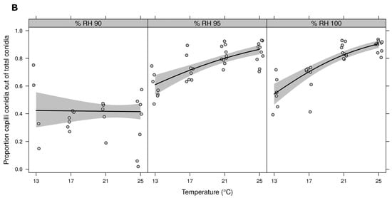 Figure 2A demonstrates that the highest number of conidia (primary conidia and capilliconidia) was produced at 95% and 100% RH at 25 °C. Also, at 13, 17, and 21 °C the number of primary conidia and capilliconidia produced was significantly (F2,114 = 4.74, p = 0.0106) higher at ≥95% RH than ≤90% RH. Further, a significant (F1,118 = 59.21, p < 0.0001) positive temperature effect on total conidia production was seen for all temperatures at ≥90% RH (Figure 2A). Figure 2B suggests that the highest proportion of capilliconidia was produced at ≥95% RH at 25 °C. The same trend occurred at lower temperatures (13, 17, and 21 °C), with ≥95% RH resulting in a significantly (F2,86 = 12.83, p < 0.0001) higher proportion of capilliconidia produced compared to lower RHs. Further, a significant (F1,90 = 31.36, p < 0.0001) positive temperature effect on proportion of capilliconidia produced was seen for all temperatures at ≥95% RH (Figure 2B). Capilliconidia production was influenced more by RH than primary conidia production, and at 90% RH, an increase in capilliconidia production with increased temperature was not observed even though it was observed for primary conidia (Figure 2A,B). No sporulation occurred at any temperature when RH was ≤85% (Figure 2A).