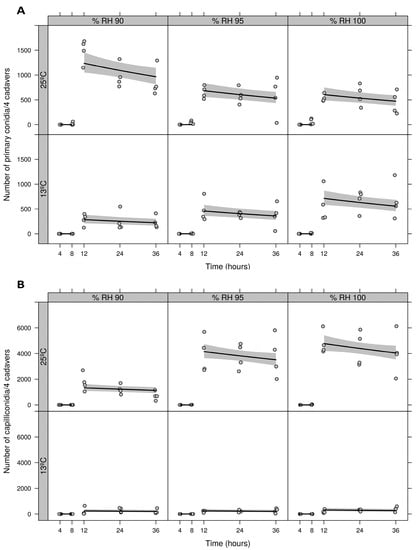 Effect of time (4, 8, 12, 24 or 36 h) on primary conidia production (A) and capilliconidia formation (B) by a Brazilian Neozygites floridana isolate (ESALQ 1420) at three different RHs (90, 95, 100%) and two temperatures (13, 25 °C).