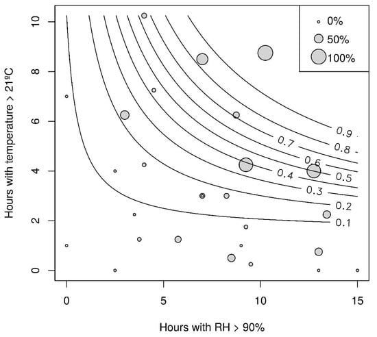 A quasi-binomial generalized linear model was fitted to the proportion of cadavers that sporulated (scored as “low” or “high” sporulation based on the categorical scale described above) including a response surface for the time spent (in hours) at RH higher than 90% and temperature higher than 21°C.