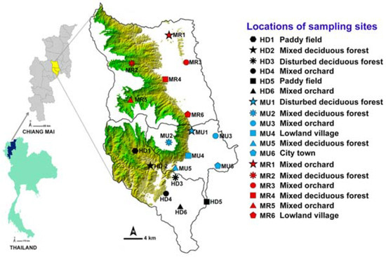 This study was conducted in three districts: Urban Mueang Chiang Mai (MU), suburban Hang Dong (HD), and Mae Rim (MR) in the central part of Chiang Mai province (Figure 1). The entire area of each of the three districts was stratified initially based on a systematic random sampling method [22]. The contour maps of Chiang Mai province (MapMagicTM scale 1:150,000 with a UTM projection type, Everest Spheroid and the Indian 1975 Datum) were used for plotting the study area. The description of study sites selection and land use categories was provided in the previous study [16]. Six different land uses were classified: disturbed mixed deciduous forest (DDF), mixed deciduous forest (MDF), mixed orchard (MO), paddy field (PF), lowland village (LLV), and city town (CT) [15,16].