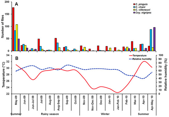 Monthly fluctuations in population density of C. pinguis, C. chani, C. villeneuvi, and Cey. nigripes determined using a reconstructable funnel trap baited with 1-day tainted beef offal in Chiang Mai province, northern Thailand, May 2009 to May 2010 (A), and Annual variation of temperature and relative humidity recorded during the fly survey (B).