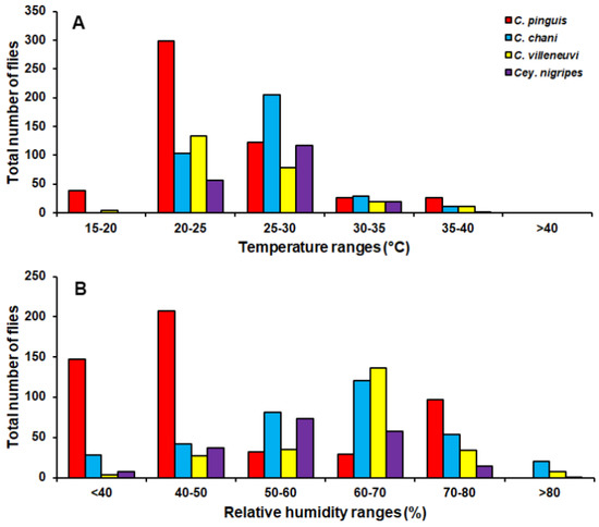 Total number of flies captured at different temperature (A) and relative humidity ranges (B).