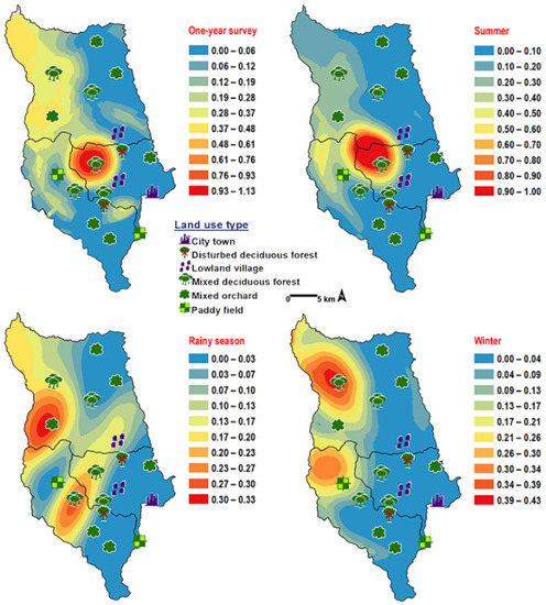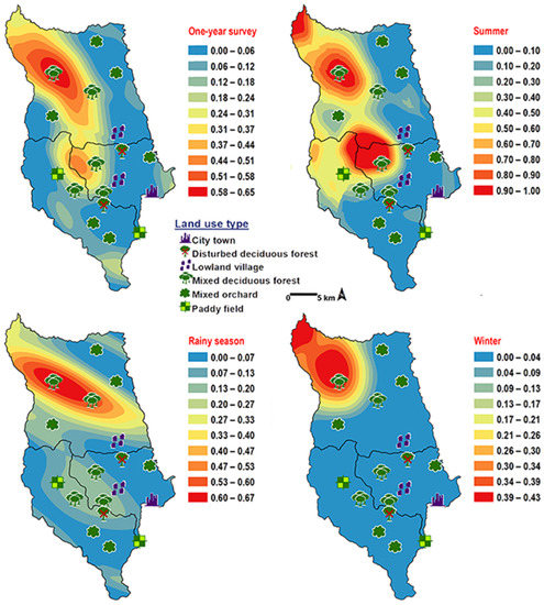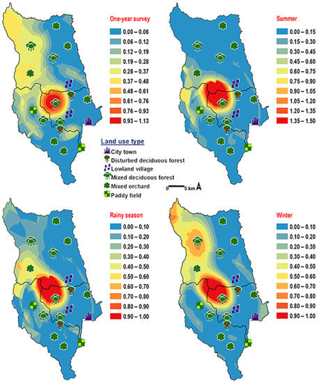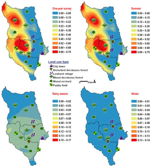 Ceylonomyia nigripes was collected widely in all land uses except for the city (Table 2). No significant relationship was found among the abundance of this species and climatic factors (Table 3). High number of flies was collected at 25–30 °C and 50–60% RH (Figure 3). Fly population data and land uses were applied to create the krigged prediction maps. A one-year survey and summer prediction maps represented similar pattern, as this species was predicted largely in MDF and other land uses along the mountainous area. Low numbers of this species were predicted in the rainy season and in winter (Figure 7).