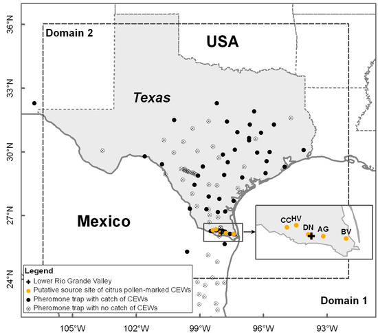 Corn earworm pheromone trap data in south-central Texas in spring 1995 is provided by USDA-ARS, College Station, Texas, USA. Male H. zea moths were checked daily from 20–22 March 1995 in a network of 109 pheromone traps [41] in Domain 1 (Figure 1), including 94 pheromone traps in Texas, USA, 1 in New Mexico, USA and 14 in Mexico. Additionally, H. zea males captured in 52 of these pheromone traps were frozen and examined for citrus pollen contamination on the body exterior by scanning electron microscope, according to the methods described by Bryant et al. [36]. The examination result of citrus pollen-marked H. zea migrants in pheromone traps was used to evaluate the new numerical trajectory model. Detailed occurrence data of pollen-marked H. zea during 20–22 March 1995 in south-central Texas are presented in Table 1. Pheromone traps were deployed to collect CEW moths at five locations (viz Bay View, Texas (BV, 97.40° W, 26.14° N), Donna, Texas (DN, 98.03° W, 26.21° N), Citrus City, Texas (CC, 98.39° W, 26.33° N), Adams Garden, Texas (AG, 97.78° W, 26.18° N) and Heald Valley, Texas (HV, 98.23° W, 26.36° N)) that spanned the major axis of the citrus production region of the LRGV region (Figure 1). There were numerous other citrus orchards in the LRGV, but the five reported trap locations (Figure 1) represent the extent of the citrus production region, and were in peak bloom at the time H. zea collections were made. Therefore, use of the five trajectory source locations represent samples within a confirmed source area of both CEWs and the unique citrus pollen (marker). Specifically, general occurrence of H. zea in blooming citrus groves at these 5 locations from 19–21 March 1995 (the previous day of sample days) was also revealed by the pheromone traps: BV (average daily number of trapped H. zea males was 2), DN (4), CC (8), AG (12) and HV (3).