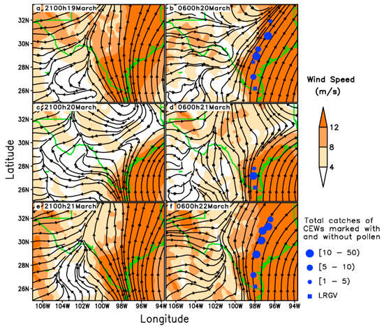 Wind fields at 950 hPa from 21:00 h to 06:00 h the next morning (local time) and pheromone trap catches of H. zea (CEWs) in Texas on 19–21 March 1995. Streamlines present wind fields; solid circles indicate locations where citrus pollen-marked CEW was captured.