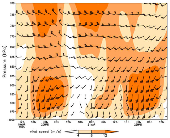 Vertical profile wind field with pressure-altitude and time for the period of 19–21 March 1995 at Karnes City, Texas, USA.