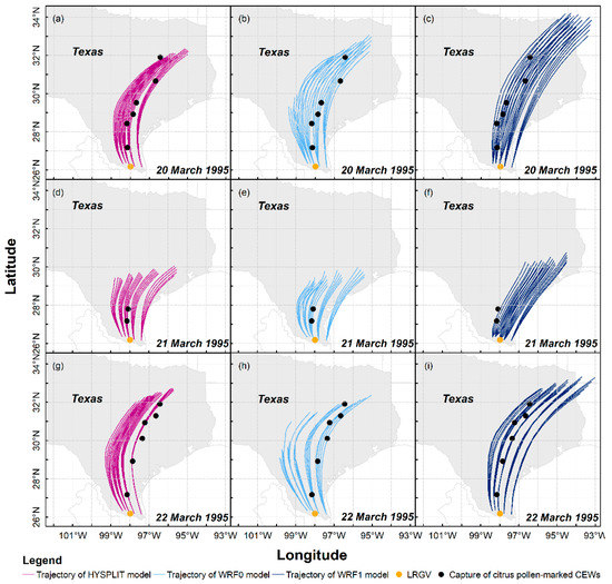 As outcomes of wind fields displayed in Figure 2, 225 long-distance flight trajectories of H. zea migrants on 20–22 March 1995 were calculated using three trajectory modelling schemes, that is, HYSPLIT, WRF0 with no flight behavior of H. zea and WRF1 with the flight behavior (Figure 4), and 75 trajectories were obtained in each scheme, and all trajectories simulated from different modeling schemes present similar migration pattern of H. zea in Texas. Specifically, the synoptic background during the first computed night determined that the calculated trajectories extended northward in southern Texas first, then drifted northeastward over central Texas and the border of Texas and Louisiana (Figure 4a–c). The low wind speed at 950 hPa on the night of 20 March over Texas accounted for the short-distance dispersal of H. zea migrants departing from southern Texas (Figure 4d–f), and only Falfurrias and Alice, Texas (approximately 180 km from the LRGV) collected one pollen-contaminated H. zea male. The calculated trajectories on 22 March 1995 (Figure 4g–i) showed similar patterns with those on 20 March 1995 (Figure 4a–c). Due to westerly air currents over western Texas that were unfavorable for long-distance northward flights of windborne H. zea migrants, there were 5 and 11 trajectories calculated from WRF0 on the first and third night, respectively, tending to stretch westward but terminated before H. zea migrants completed the 12-h migration process.