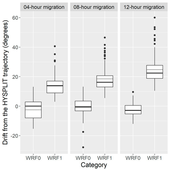 The degrees of trajectory direction of H. zea migration trajectories calculated by WRF0 and WRF1 drifting from the standard Hybrid Single-Particle Lagrangian Integrated Trajectory (HYSPLIT) trajectory of three flight durations, respectively. The bottom and top of the box indicate the lower and upper quartile values, respectively. The horizonal solid black line shows the median for each category, and the black dashed line represents the mean. Whiskers indicate the 5th and 95th percentiles, while the black circle represents the outlier.