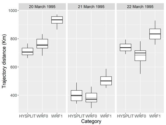 The distance from the starting source area to the endpoints of H. zea migration trajectories calculated by the HYSPLIT, WRF0 and WRF1, respectively. The bottom and top of the box indicate the lower and upper quartile values, respectively. The horizonal solid black line shows the median for each category, and the black dashed line represents the mean. Whiskers indicate the 5th and 95th percentiles.