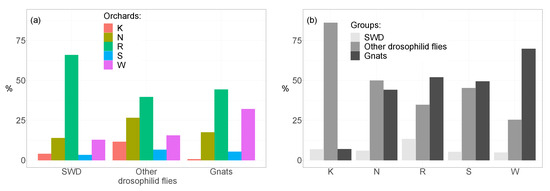 SWD, other drosophilid flies, and gnats between (a) and within (b) orchards. Parasitic wasps are not shown due to their low number. Abbreviations for orchards: K = Kaisten, N = Notikon, R = Rotkreuz, S = Schupfart, W = Wölflinswil.